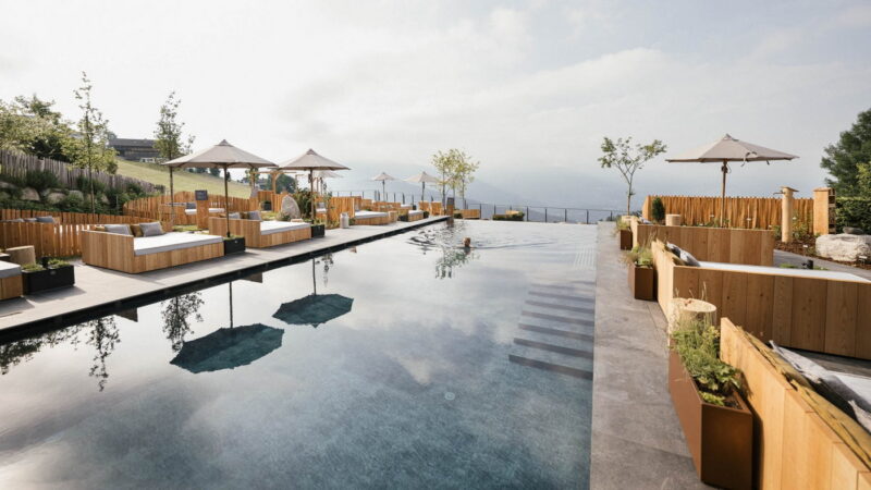 Mit Weitblick auf die Talsohle des Vinschgaus, die Ötztaler Alpen und die Ortlergruppe liegt das Alpin & Relax Hotel Das Gerstl auf einem sonnenverwöhnten Südhang. Dieser Ausblick ist im Vier-Sterne-Superior-Haus allgegenwärtig – vom Naturbadeteich, aus der Panorama-Sauna, dem Restaurant, den Suiten – und natürlich auch vom Infinity Pool. Seit kurzem gibt es hier die Möglichkeit, sich mit der perfekten Instagram-Kulisse im Hintergrund abzulichten. Eine Spiegelreflexkamera, die durch Drücken eines am Beckenrand angebrachten Knopfes ausgelöst wird, macht es möglich. Einfach auf die markierte Selfie-Zone begeben, posen und knipsen. Das neue Lieblingsbild wird dann per E‑Mail vom Hotel direkt aufs Handy geschickt.