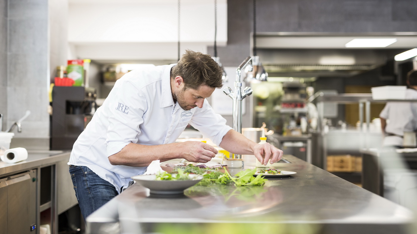 Hannes Müller ist nicht nur Hotel‑, sondern auch Küchenchef im Restaurant der Forelle. Für seine Gäste entwirft er immer wieder neue Kreationen. Das Besondere dabei ist, dass in die Küche ausschließlich Zutaten aus der Region sowie ausgewählte, fair hergestellte Produkte aus der Alpen-Adria-Region kommen.