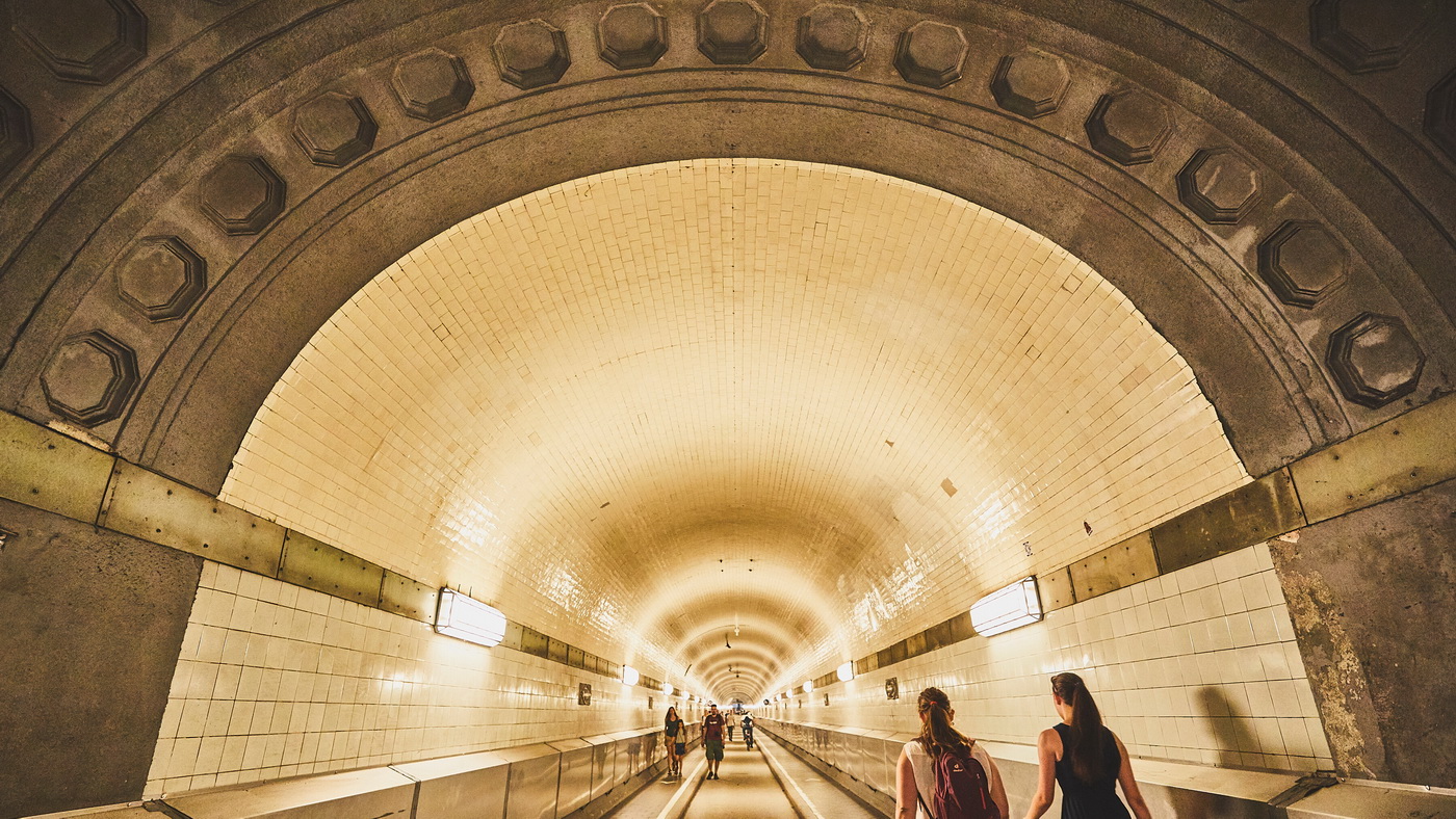 Von dort geht es zu den Landungsbrücken – dem Herzen des Hamburger Hafens. Nach einem Spaziergang entlang der Brücken lohnt sich der Gang durch den Alten Elbtunnel, an dessen Ende der Aussichtspunkt Steinwerder mit Panoramablick auf die Skyline der Stadt wartet. Dieses technische Meisterwerk war 1911 die erste Flussuntertunnelung Europas und ist ein nostalgisches Stück Hamburger Geschichte.