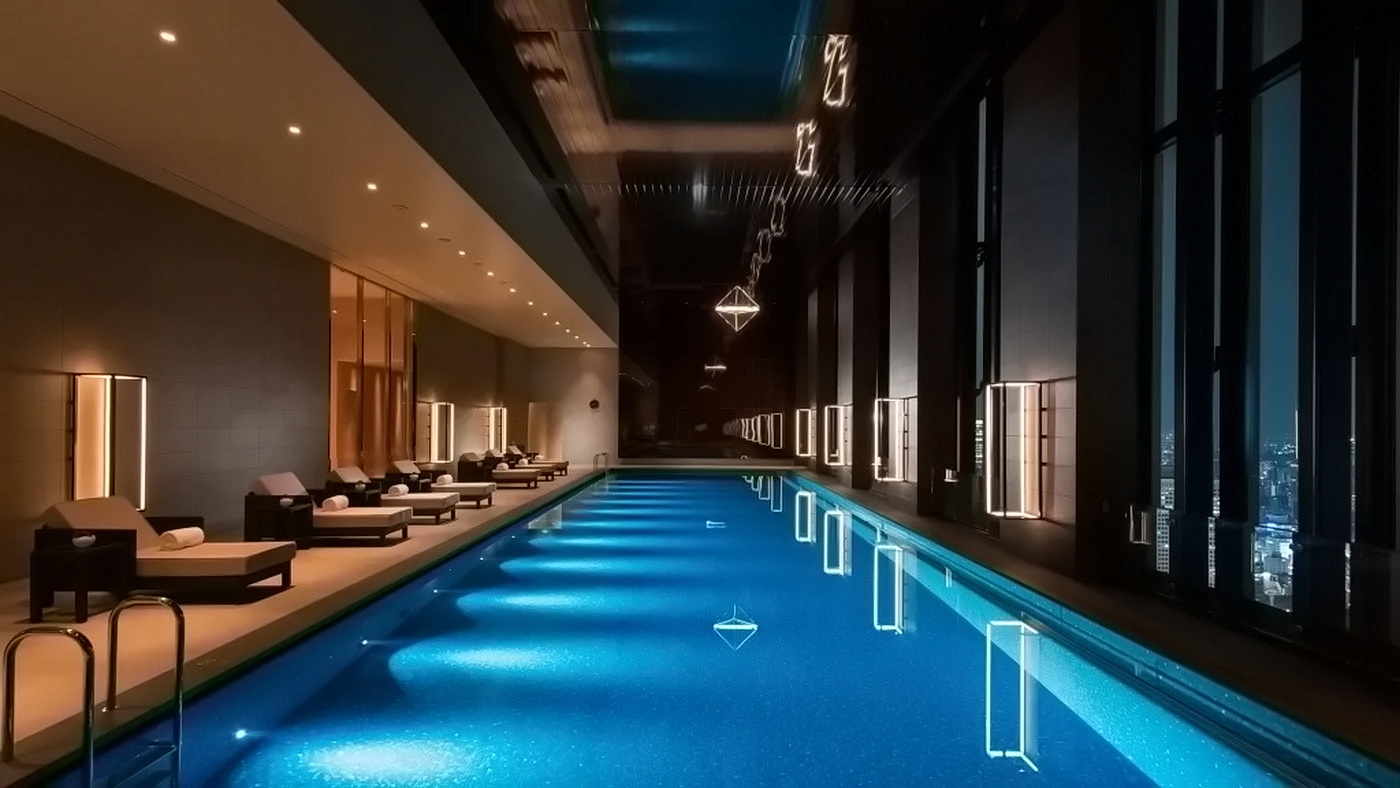 Im 38. Stock des Conrad Osaka bietet der 20 Meter lange Indoor-Pool ein fast schon surreales Erlebnis. Tagsüber hat man das Gefühl, durch die Wolken hoch über der Stadt zu gleiten – und nachts taucht man in ein Meer von Sternen ein und schwebt unter einem schimmernden Nachthimmel. Plüschige Liegen umgeben den leuchtenden Pool – perfekt positioniert vor den raumhohen Fenstern, die die atemberaubende Skyline der Stadt zeigen.