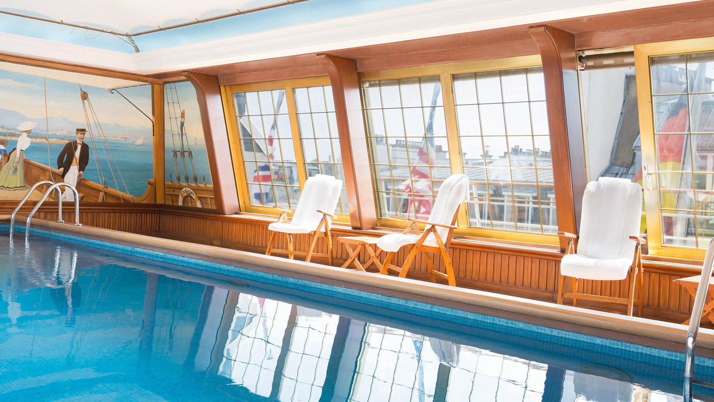 Der Indoor-Pool im obersten Stockwerk des Le Bristol Paris ist an Exklusivität kaum zu übertreffen. Sein Design im Stil eines Boots versprüht mediterranes Flair, das Wandgemälde ist eine wunderschöne Hommage an das Hôtel du Cap und die großen Fenster bieten einen magischen Ausblick über die Stadt. Selbst im Winter liegt hier französisches Laissez-faire in der Luft und lässt die Sonnenuntergänge über Paris in stilvollem Ambiente genießen.