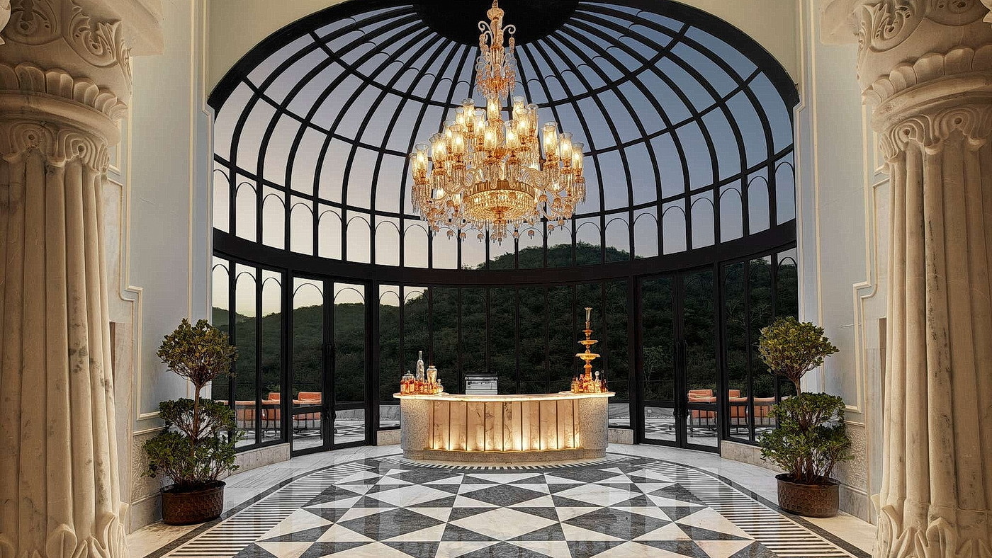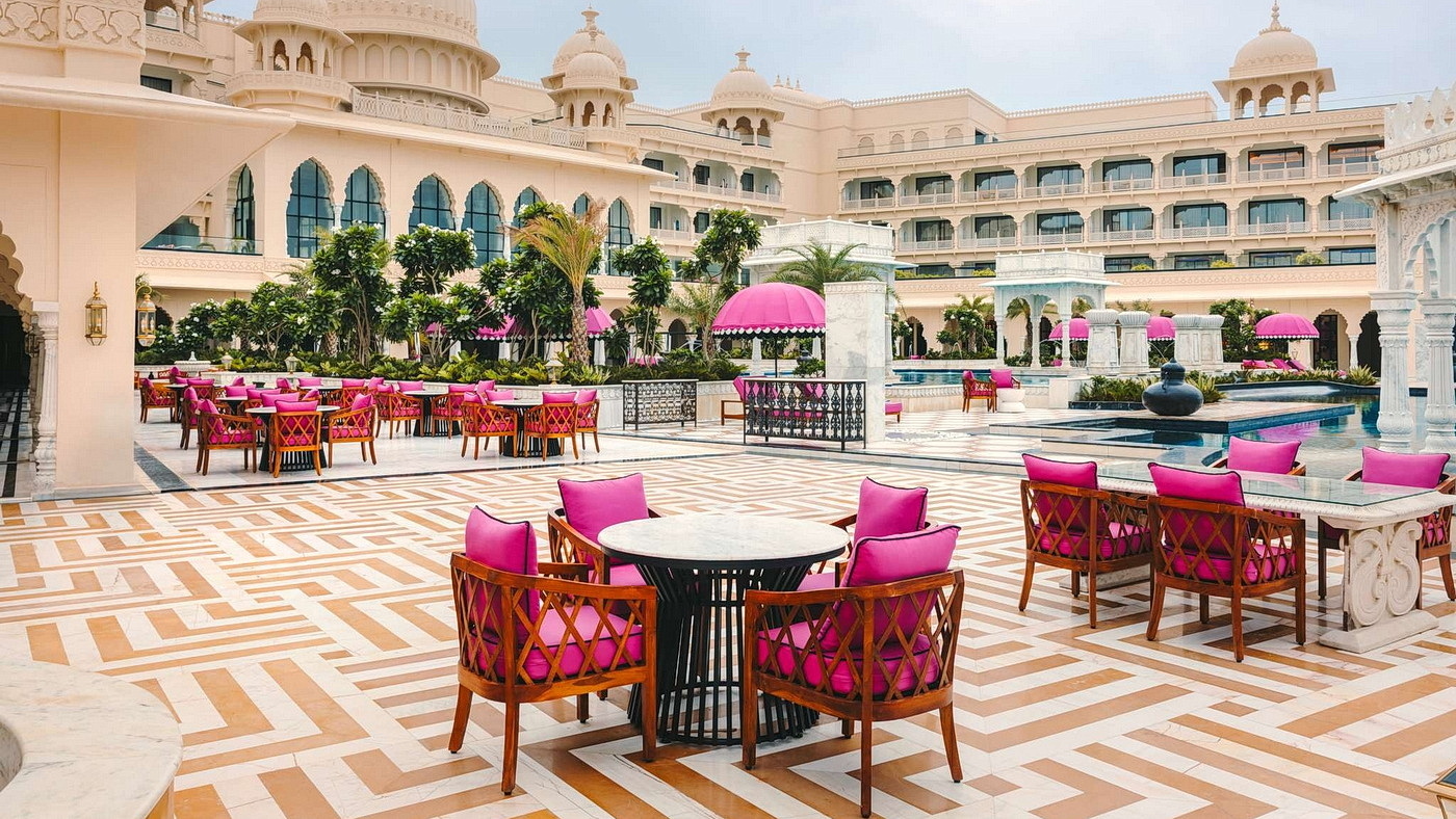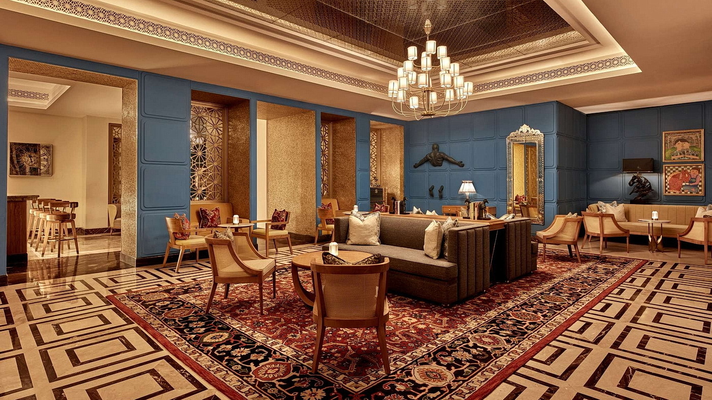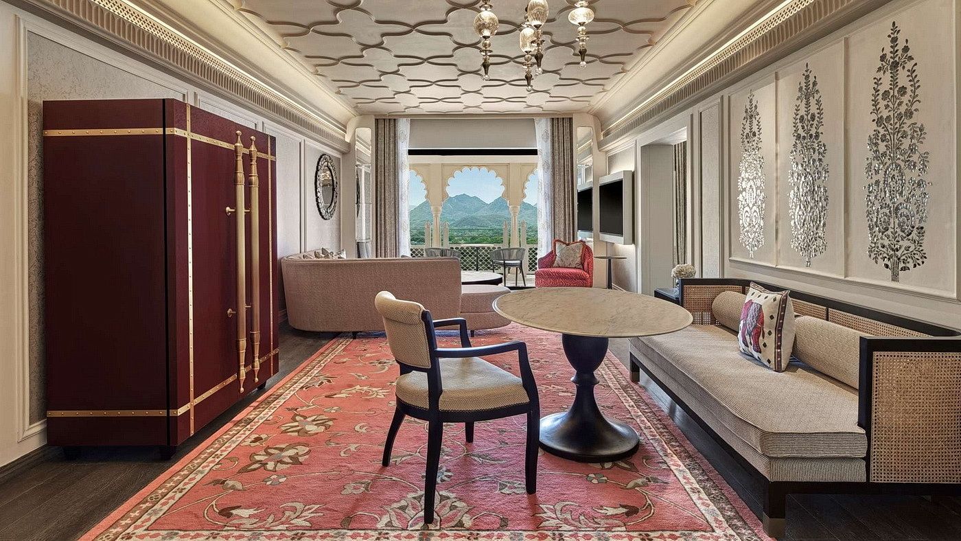 Das atemberaubende Palasthotel ist im Architekturstil der großen Festungen von Mewar verwurzelt und geprägt von Innenhöfen, Pavillons, Gärten, Kolonnaden, Stufenbrunnen und Terrassen, während vergoldete Spiegel und kunstvoll geschnitzte Rajasthani-Holzarbeiten die Räume schmücken.