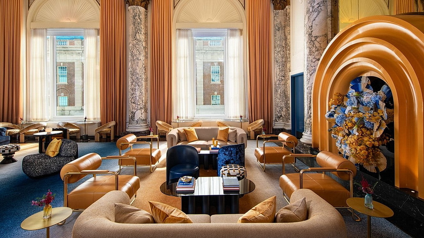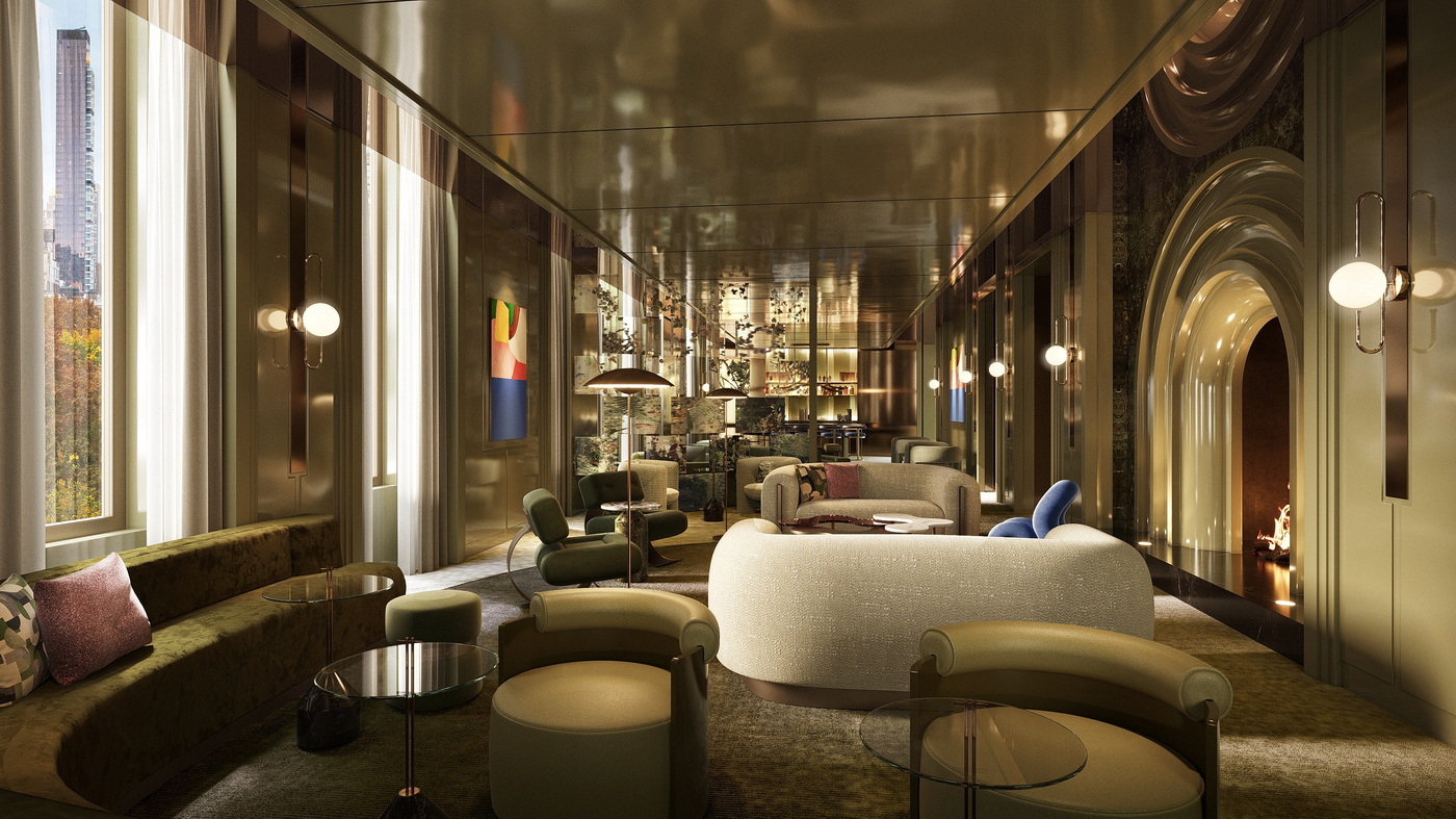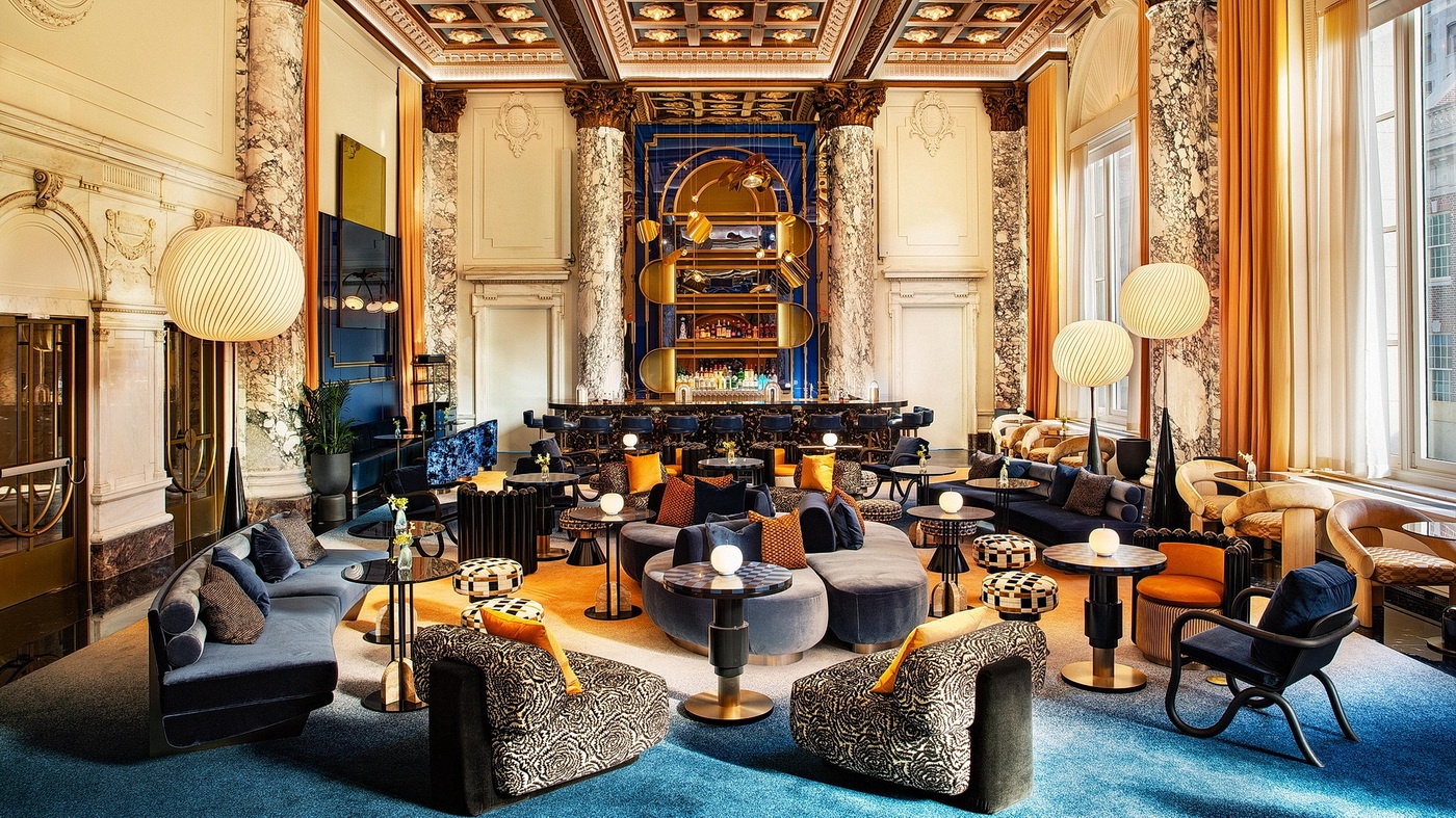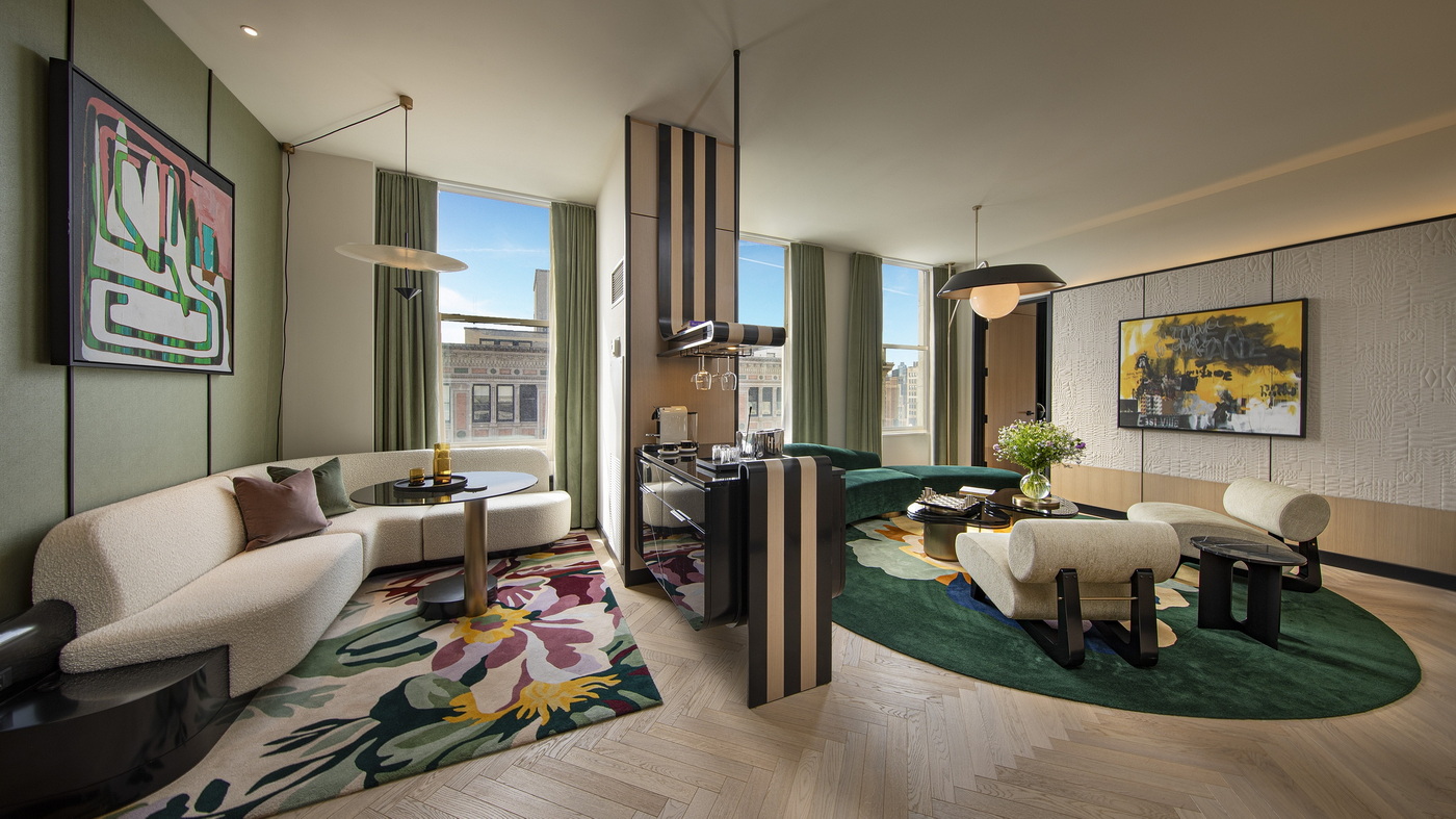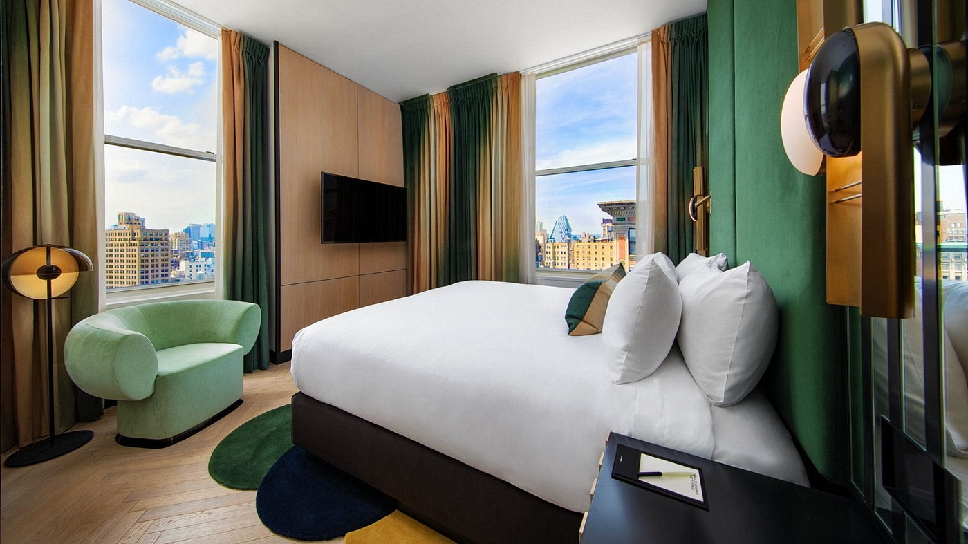 Die 256 Zimmer und Suiten sind in Grün‑, Orange- und Grautönen gehalten. Vorhänge und Bett-Kopfteile aus orangefarbenem Samt, Teppiche mit botanischen Mustern, lackierte Wände und Ombré-Tapeten sollen den nahen Union Square Park im Wandel der Jahreszeiten widerspiegeln. Jagdgrüne Tuft-Sofas, runde Bronzetische und unerwartete Farbtupfer – etwa in Form von taxigelben Wasserhahn-Drehgriffen im Badezimmer – unterstreichen das maximalistische Design.