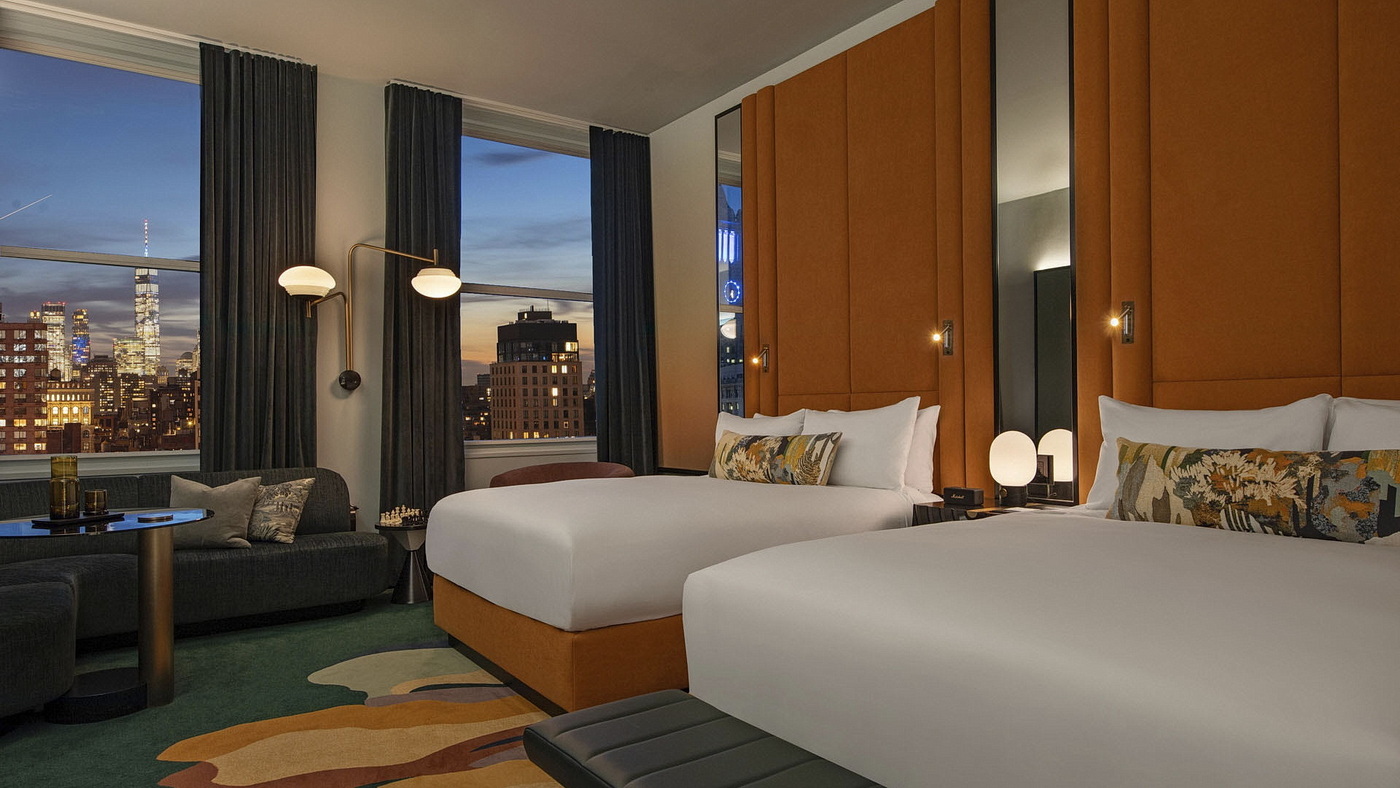 Die Nachttische erinnern an die Kunstinstallation „Metronome“ am Union Square South und die speziell angefertigten Lampen an die Leuchten an den U‑Bahn-Eingängen. Das W‑Bett mit Pillow-Top-Matratze verspricht erholsame Nachtruhe, während die Temperaturregelung per Knopfdruck und Smart-TVs für modernen Luxus sorgen. In den Bädern warten italienische Pflegeprodukte von Davines und über die Marshall-Bluetooth-Lautsprecher ertönt der Soundtrack zum morgendlichen Aufwachen oder zum Styling-Ritual am Abend.