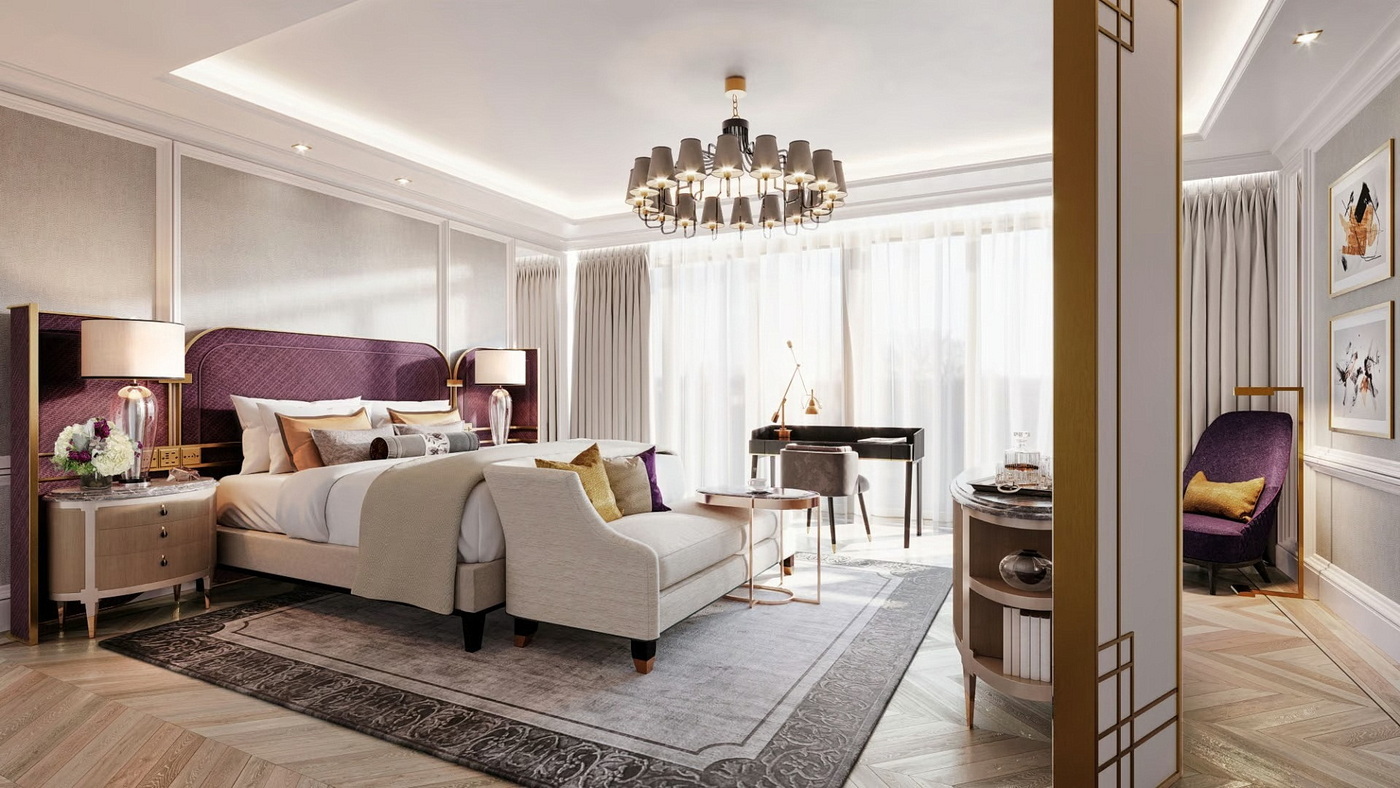 Viktorianisch inspiriertes, handgemaltes Silber-Pergament mit Szenentapeten bildet eine historische Kulisse. Ergänzt durch einen maßgefertigten Kronleuchter aus vergoldetem Messing und Kristalleinsätzen als abstrakte Interpretation von Baumzweigen und Regen. Zwischen dem zentralen Atrium und einer Panorama-Dachterrasse gelegen, ist das Ein-Schlafzimmer-Penthouse von natürlichem Licht durchflutet. Preis: ab 15.000 Euro pro Nacht.