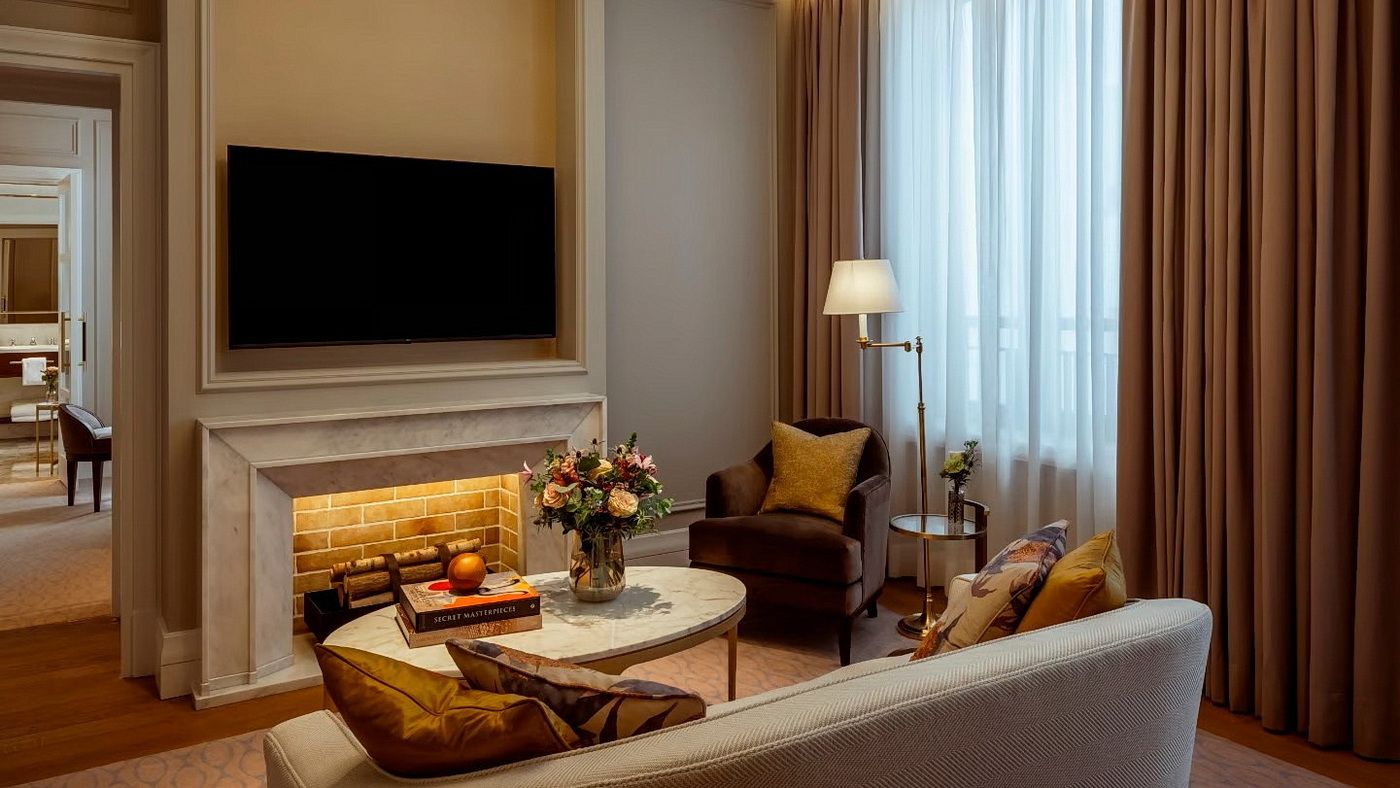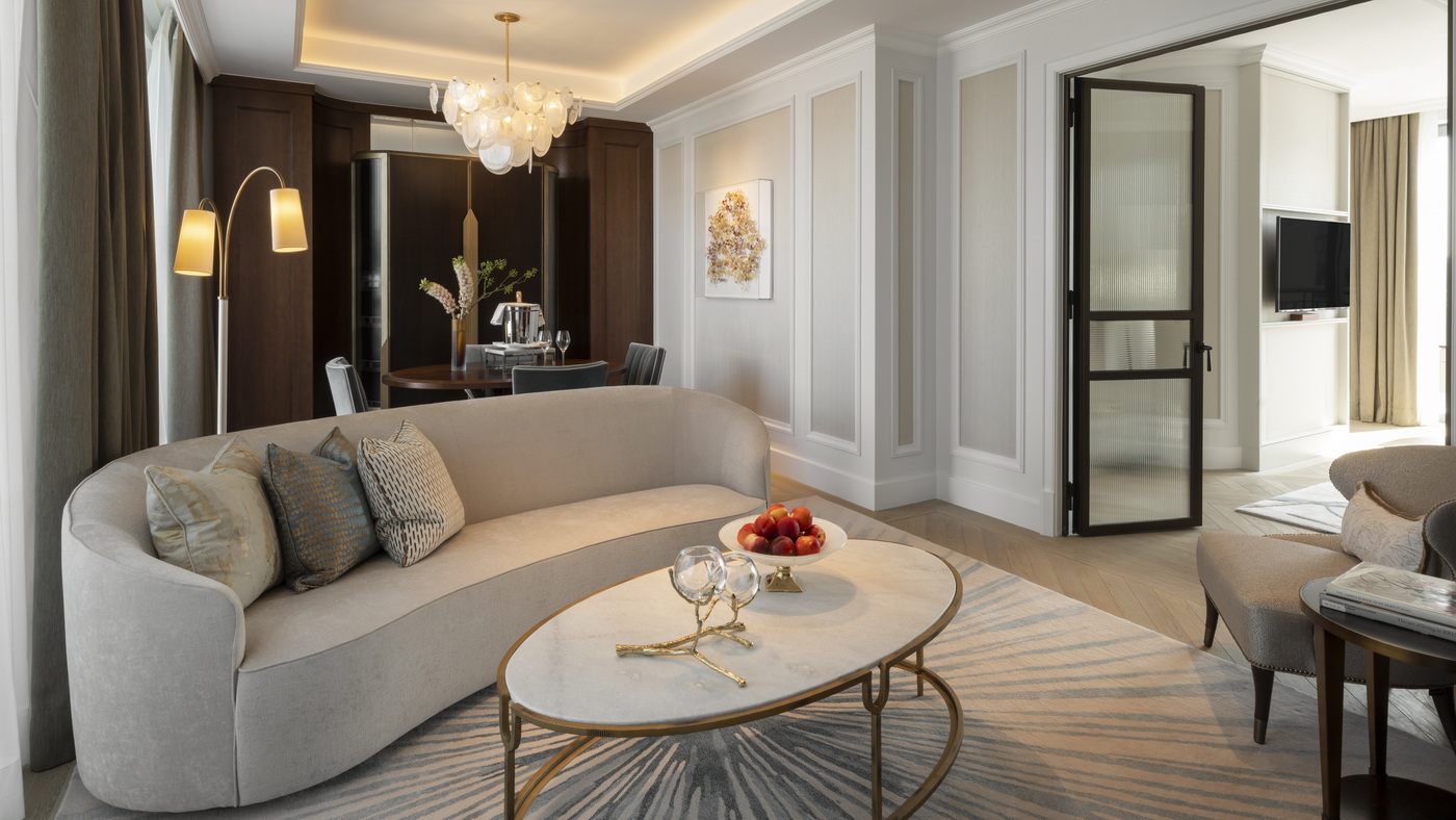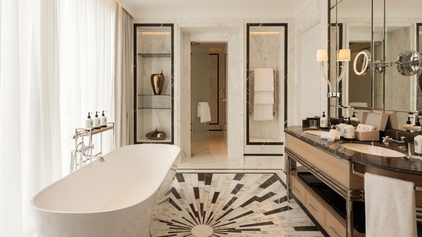 Calacatta-Verde-Marmor und eine markante muschelförmige Wand hinter der Badewanne unterstreichen die Symbiose aus historischem Erbe und moderner Raffinesse – ein Echo des Glanzes, der einst königlichen Gästen um die Jahrhundertwende vorbehalten war. Eine diskrete Glastür verbindet die Ein-Schlafzimmer-Suite zudem mit einem angrenzenden Deluxe-Zimmer und verwandelt sie so in eine großzügige Familienresidenz. Preis: ab 11.000 Euro pro Nacht.