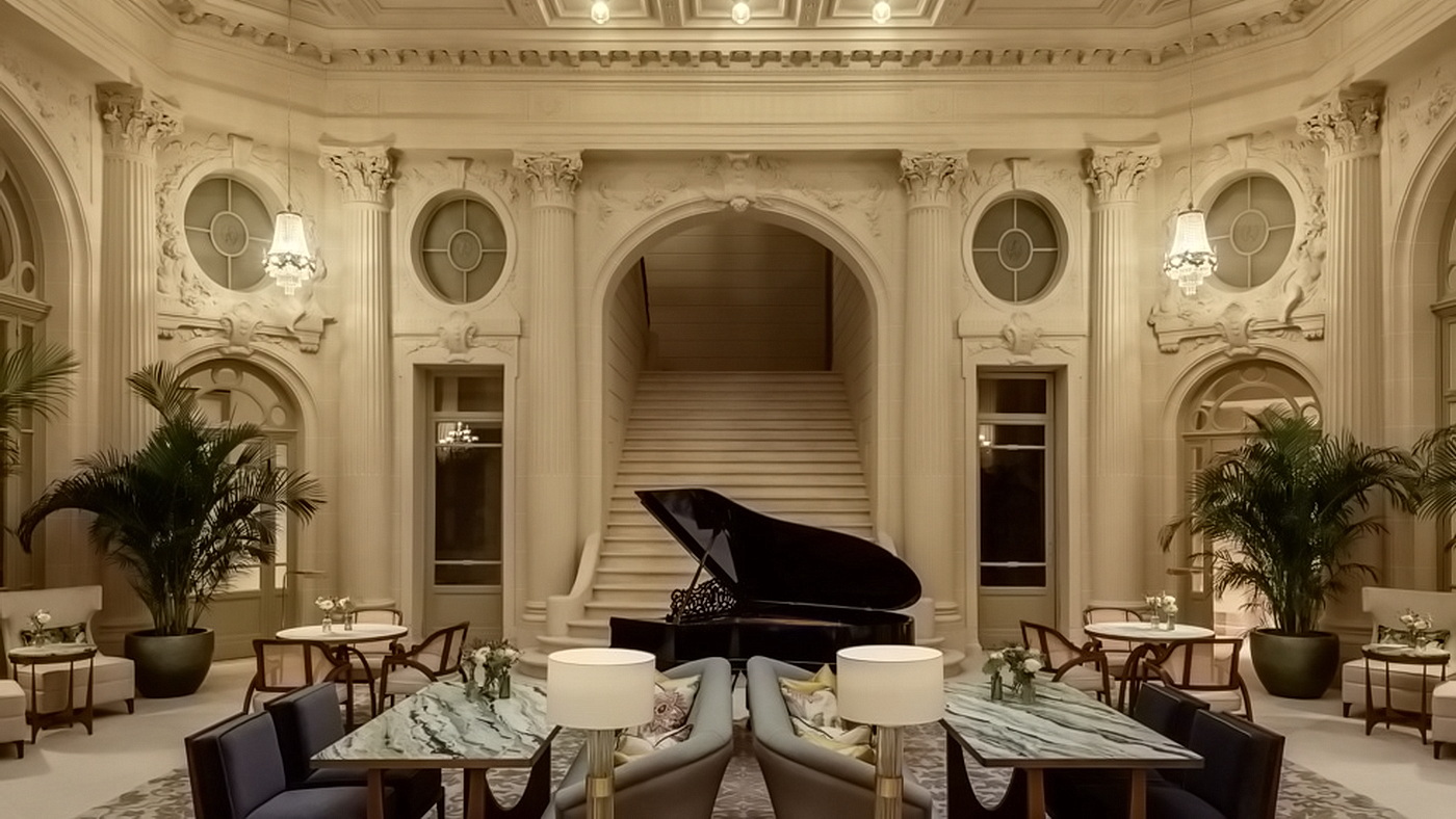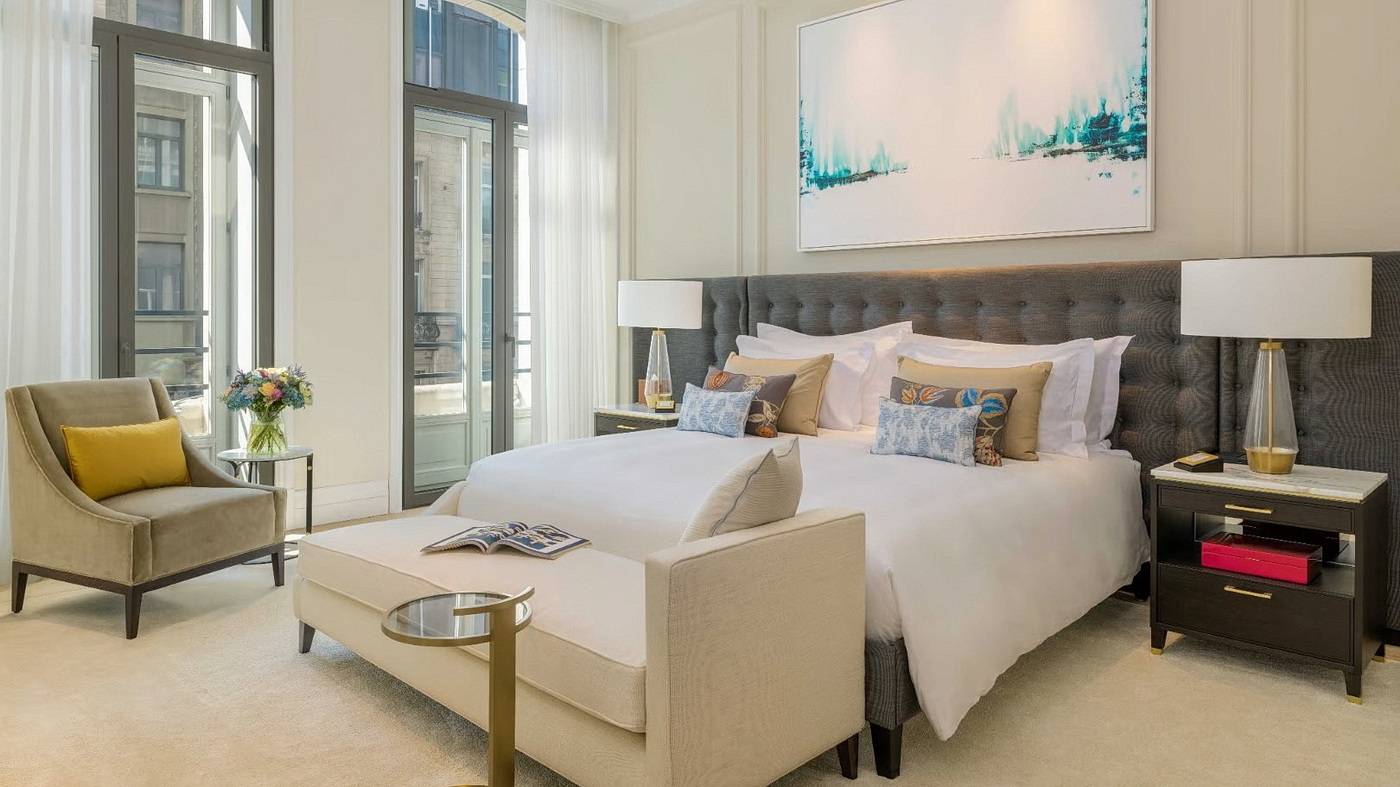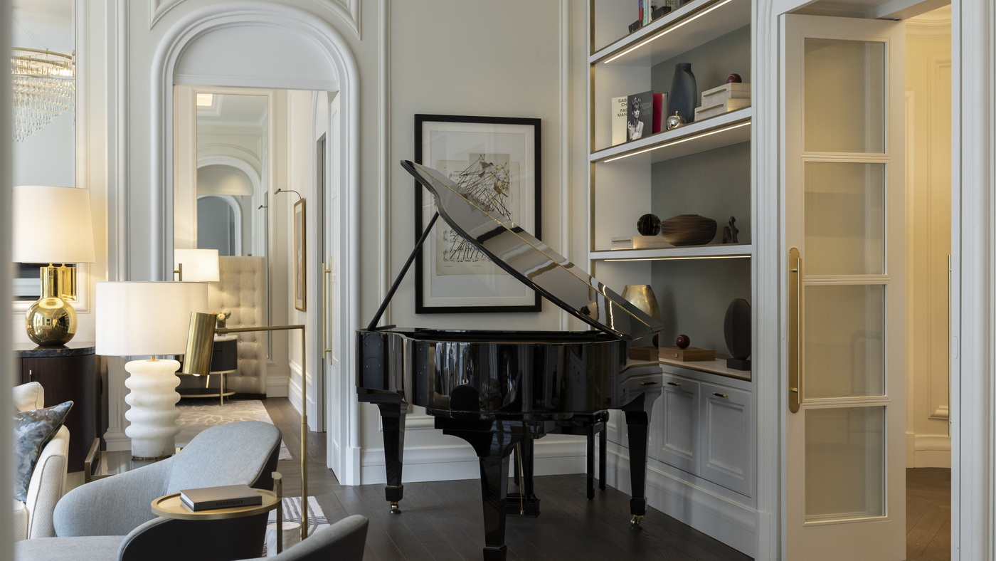 Eine private Terrasse eröffnet den Blick auf die berühmte Rue Royale, während die Innenräume Brüssels reichem musikalischem Erbe gewidmet sind. Ein Flügel, skulpturale Details und maßgefertigte Möbelstücke, die von Partituren inspiriert wurden, verweisen auf die Stadt und ihre Verbindung zu Komponisten wie César Franck und dem Erfinder des Saxophons, Adolphe Sax.