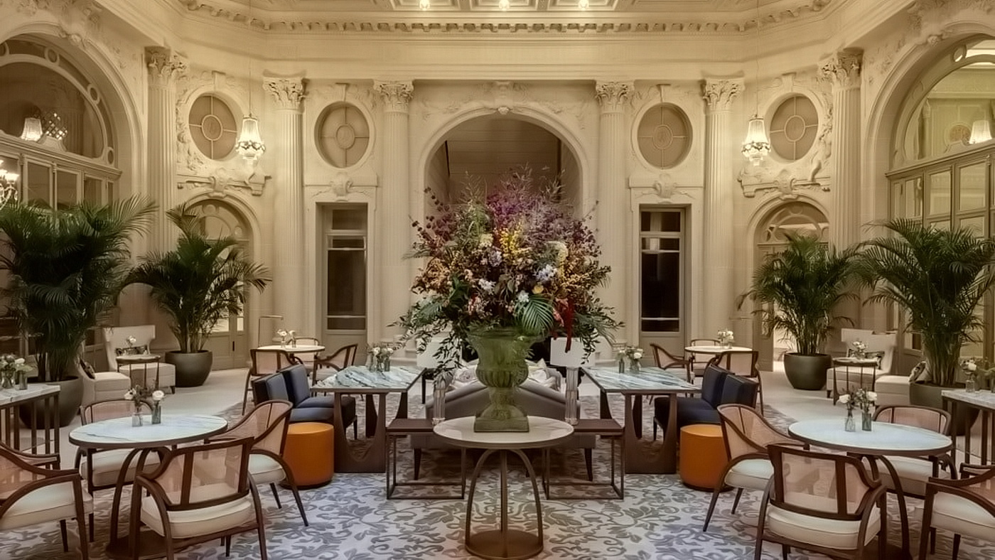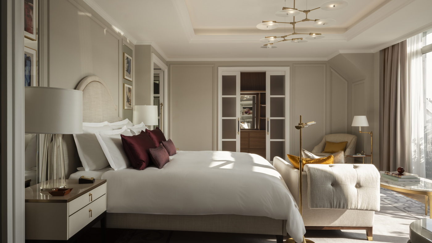 Im sechsten Stock des Hotels gelegen, entfaltet sich der weitläufige Wohnbereich zwischen einer Panorama-Terrasse auf der einen Seite und dem zentralen Atrium auf der anderen – stets mit spektakulären Ausblicken auf die Stadt und einer beeindruckenden Großzügigkeit von Licht und Raum. Vertäfelungen aus Eukalyptusholz und kunstvolle Stuckarbeiten umrahmen eine anspruchsvolle Farbwelt, die durch Magenta-Akzente und Kastanien-Nuancen bereichert wird.