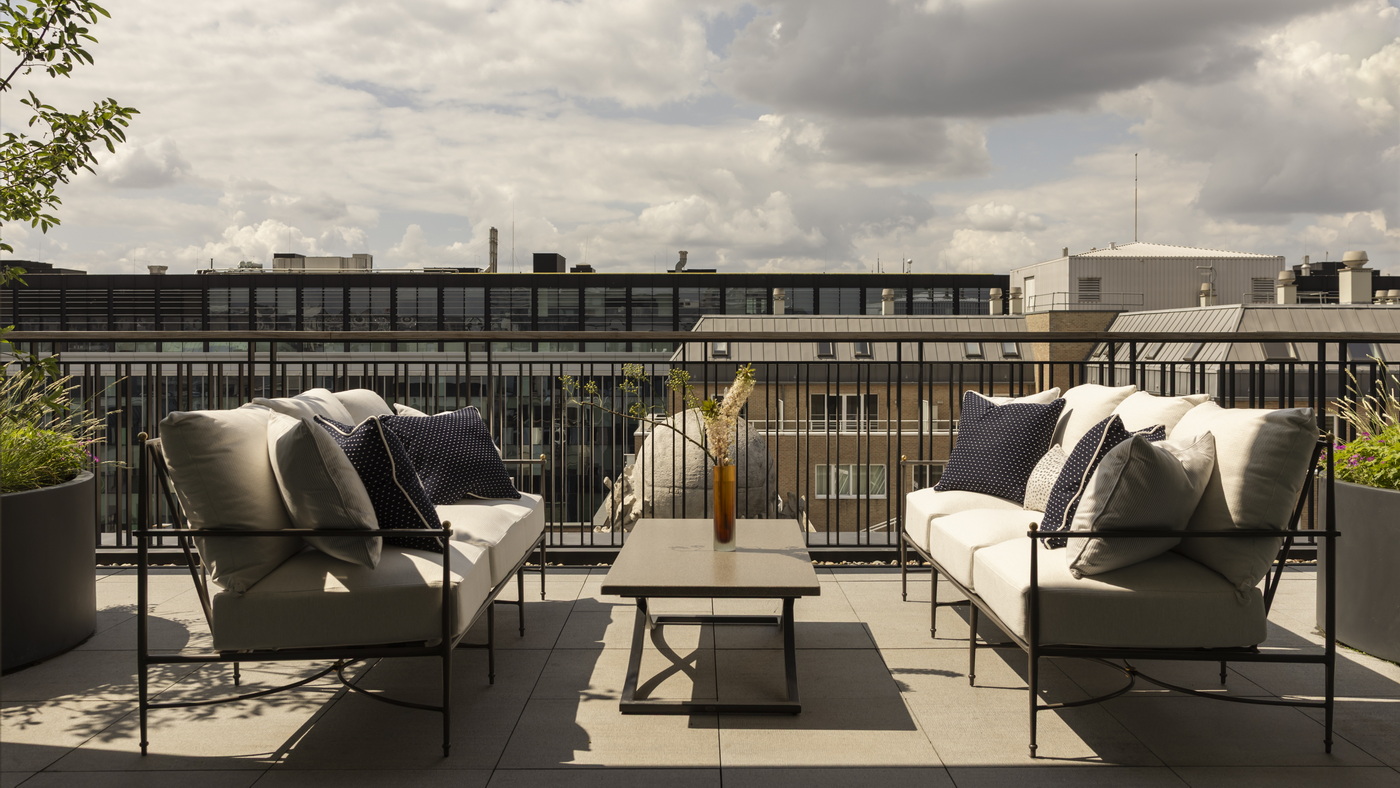 Angelehnt an die Meisterwerke von Bruegel und Rubens, präsentiert sich das 300 Quadratmeter große „Grand Master Penthouse” mit zwei Schlafzimmern. Tiefblaue Töne, ein eleganter Marmorkamin und eine maßgefertigte Bar prägen die beiden großzügigen Wohnbereiche mit ihren privaten Terrassen. Während eine Terrasse als intimer Rückzugsort im Freien dient, eröffnen sich auf der anderen weitreichende Ausblicke über die Dächer Brüssels – komplett mit Essbereich und Lounge.
