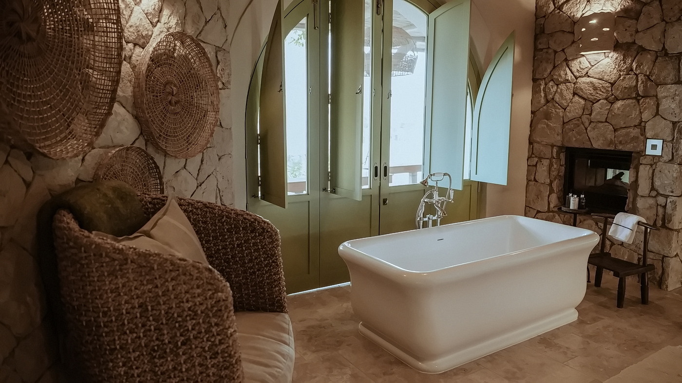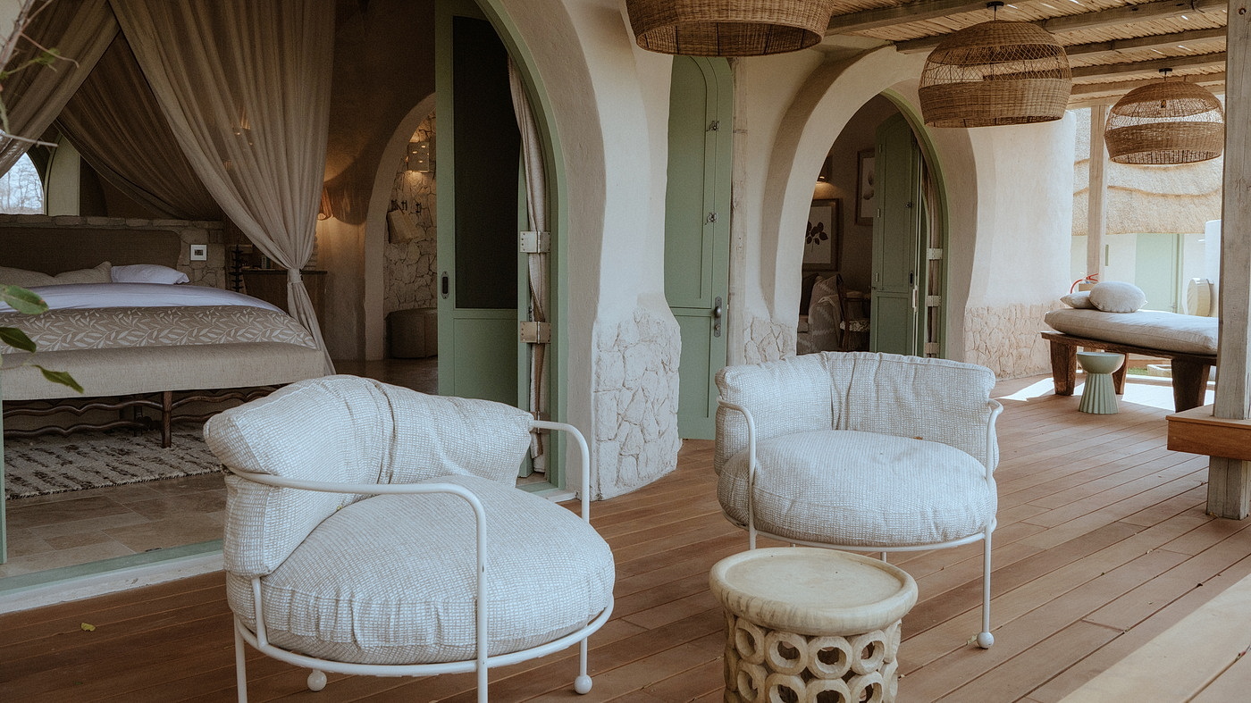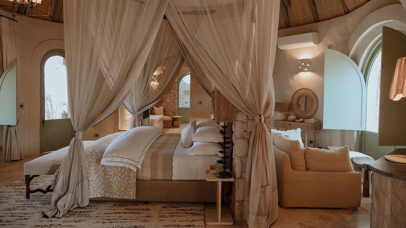 Klare Linien, natürliche Materialien und eine neutrale, von lokalem Stein inspirierte Farbpalette vermitteln Ruhe, während Akzente in sanften Grüntönen und Terrakotta die traditionelle afrikanische Handwerkskunst aufgreifen. Naturfasern, strukturierte Teppiche und dezente Muster runden das Bild ab. Ein fließender Übergang von drinnen nach draußen und Sitzgelegenheiten im Freien verbinden gleichzeitig mediterrane Eleganz mit Safari-Lifestyle.