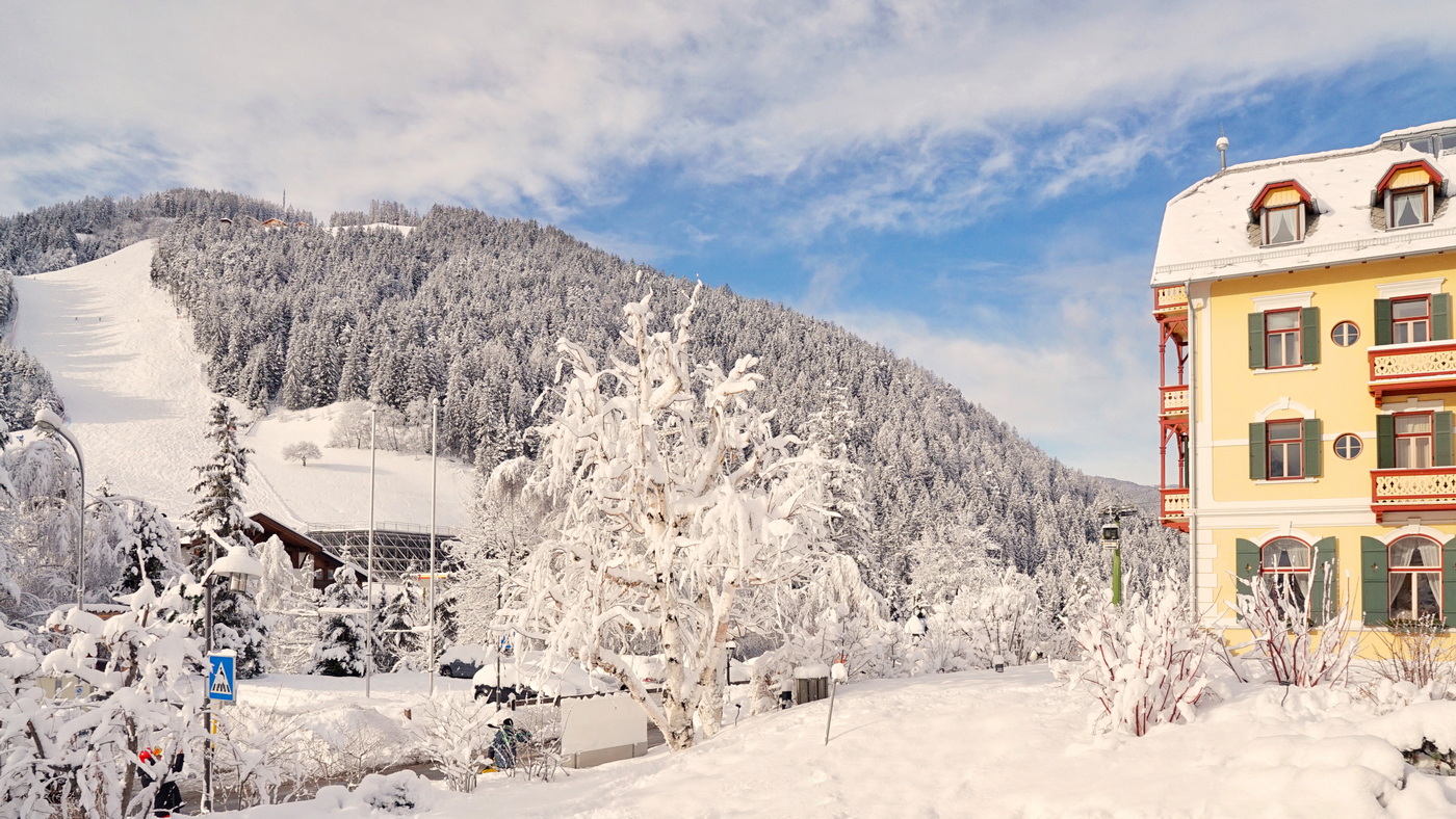 Bereits in den 1930er-Jahren schmückte das Hotel Monte Sella so manches Werbeplakat, auf dem die Skifahrer die Hänge direkt vor dem Jugendstilgebäude hinuntergleiten – und auch heute noch genießen die Gäste im Historic South Tyrol Hotel den Winter im historischen Ambiente nur 20 Meter von der Talstation am Kronplatz entfernt. Das Haus gehört zur Historic South Tyrol Gruppe – einer Vereinigung von Gastgebern, die historische Anwesen bewahren und der Geschichte Tribut zollen. Vor den altehrwürdigen Hoteltüren liegen den Wintergästen 121 abwechslungsreiche Pistenkilometer zu Füßen. Preis in der Wintersaison: ab 150 Euro pro Person und Nacht inklusive Halbpension.