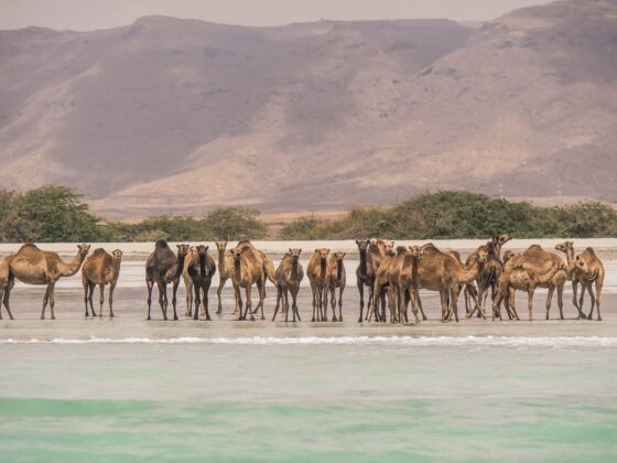 Dromedare sind bekannt dafür, extrem hohen Temperaturen zu trotzen und lange Zeiträume ohne Wasser auskommen zu können. Dornige Sträucher gehören zu ihren Leibgerichten. Umso überraschender ist, dass man die Tiere im Dhofar – der südlichsten Region des Oman – auch direkt am Sandstrand des Ozeans oder in den türkisfarbenen Gewässern der Wadis antrifft. Dort stillen sie ihren Durst und erfrischen sich. Einige schwimmen sogar im Meer, um von einer Bucht in die nächste zu gelangen, wo dann am Strand neue Nahrung oder ein möglicher Partner wartet. Ein skurriles und gleichzeitig äußerst beliebtes Fotomotiv.