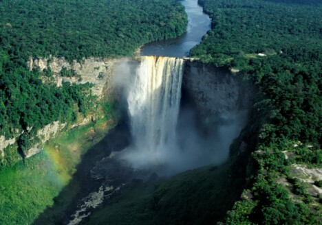 Gi­gan­ti­sche 226 Me­ter stür­zen die to­sen­den Flu­ten des Pot­aro Flus­ses bei den erst im Jahr 1870 ent­deck­ten Kaie­teur Falls in die Tiefe – mit­ten im na­hezu un­be­rühr­ten Dschun­gel von Gu­yana.