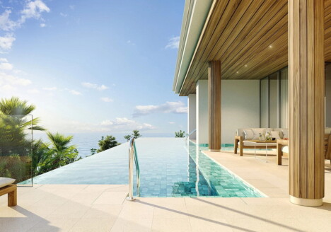 Von den Ter­ras­sen der lu­xu­riö­sen Un­ter­künfte geht es di­rekt ins Meer